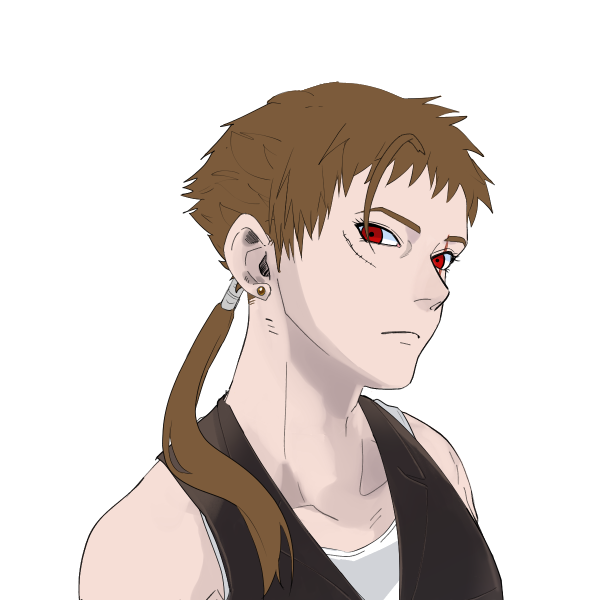 ・短い赤髪に赤褐色の瞳、日焼けした肌で、密度の高い筋肉を纏ったすらっとした長身の男性。筋肉の密度は有角族の血に由来する。