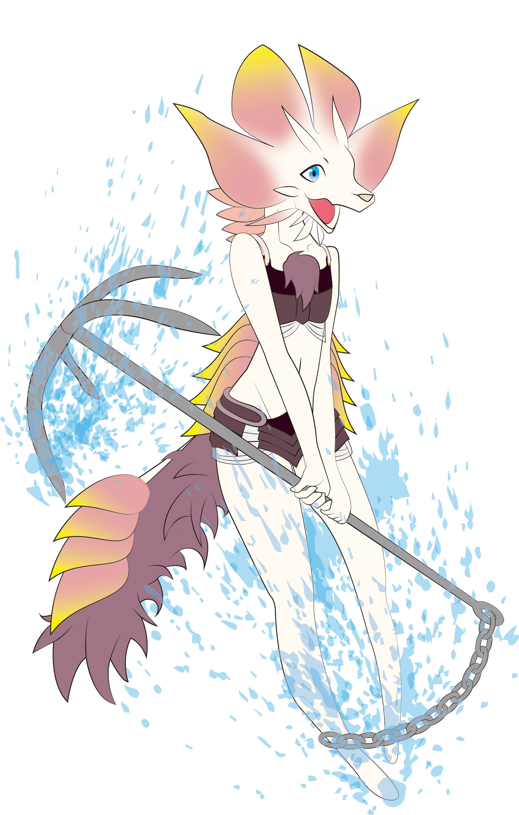 所謂ビキニアーマーに似た大胆な鎧を纏い、身の丈程もある四爪錨を軽々と振り回すサハギンの美女(ただし魚のため胸は極めて貧相)。水の魔法を補助として使うことで遊泳法を再現し、踊るようで揺蕩うような趣ある動きから強烈な一撃を放つ。今のところこれといった目的は無いが、困っている人はとりあえず助けたい。
