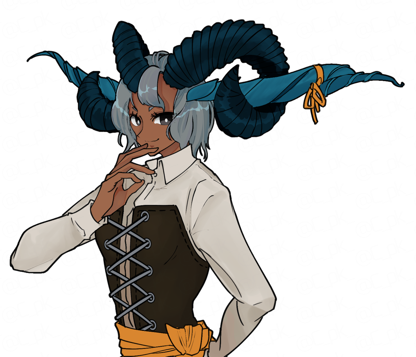 羊と牛の角を併せ持ち、ツノにリボンをつけている大柄の女性。