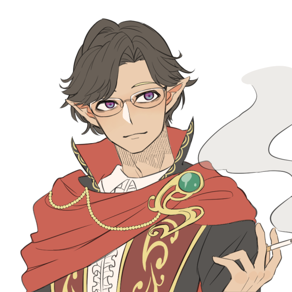 エルダナーンの男性で歳は63(まだまだ若輩)、身長は183cmで褐色の肌と黒色の髪、紫色の瞳の持ち主