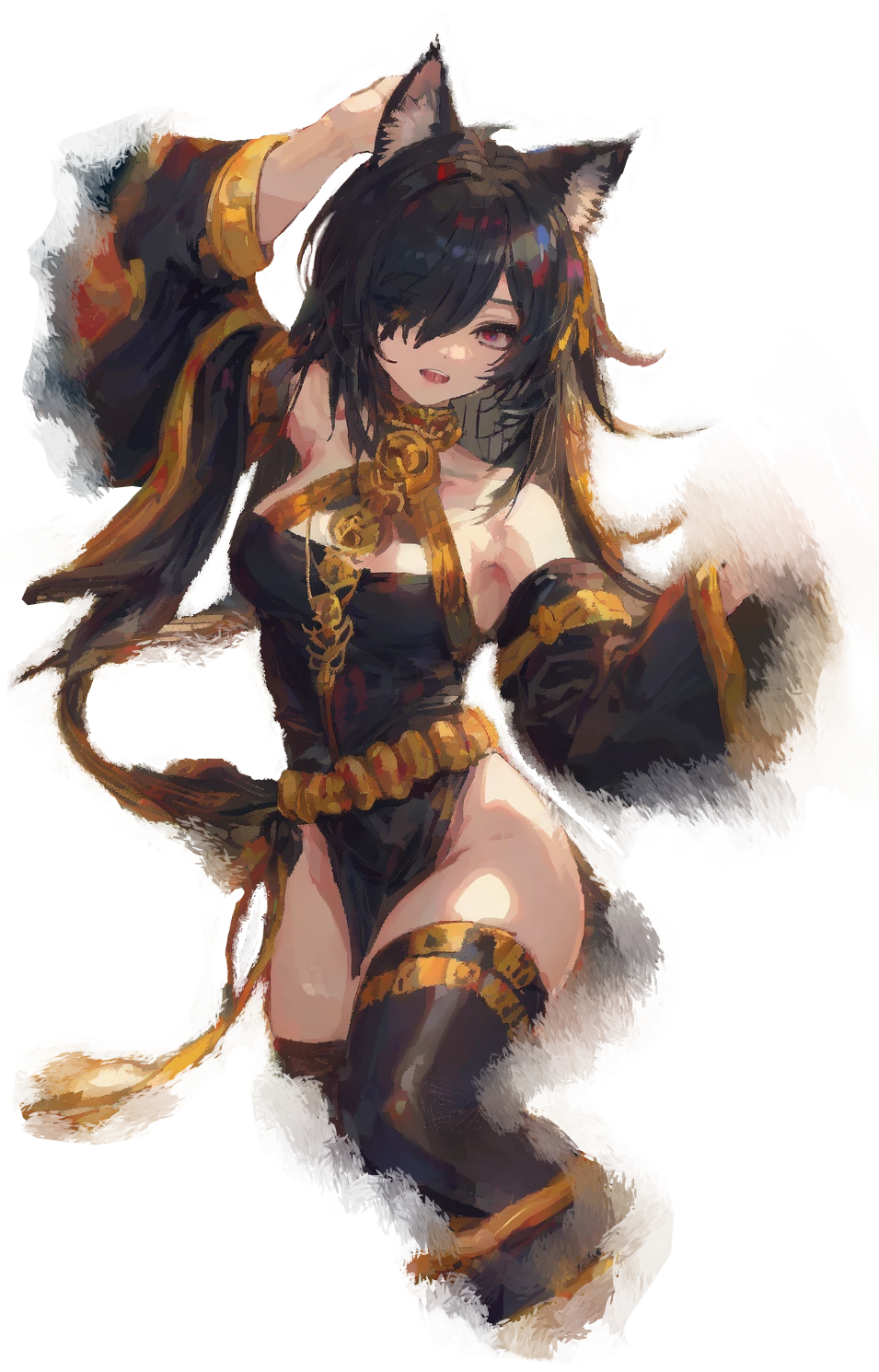 ヴァーナ猫族の特徴的なしなやかな耳と尾を持ち、目元には常に警戒心と計算高さが滲む。表向きは踊り子として艶やかに着飾り、人目を惹く微笑を浮かべるが、ふとした瞬間に、その笑みは冷たい諦観へと変わる。舞台の上では妖艶、夜の路地では狐のように狡猾な影。(猫だが)