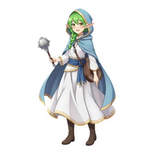 緑の豊かな髪を片お下げにしたエルフの少女。