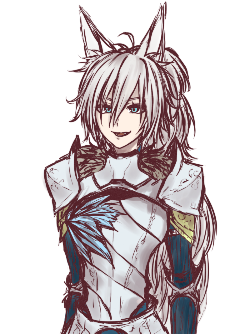 耳: 頭頂部から突き出た大きな狼の耳。銀白の毛に覆われており、周囲の音に敏感に反応する。感情に応じてピクリと動く。