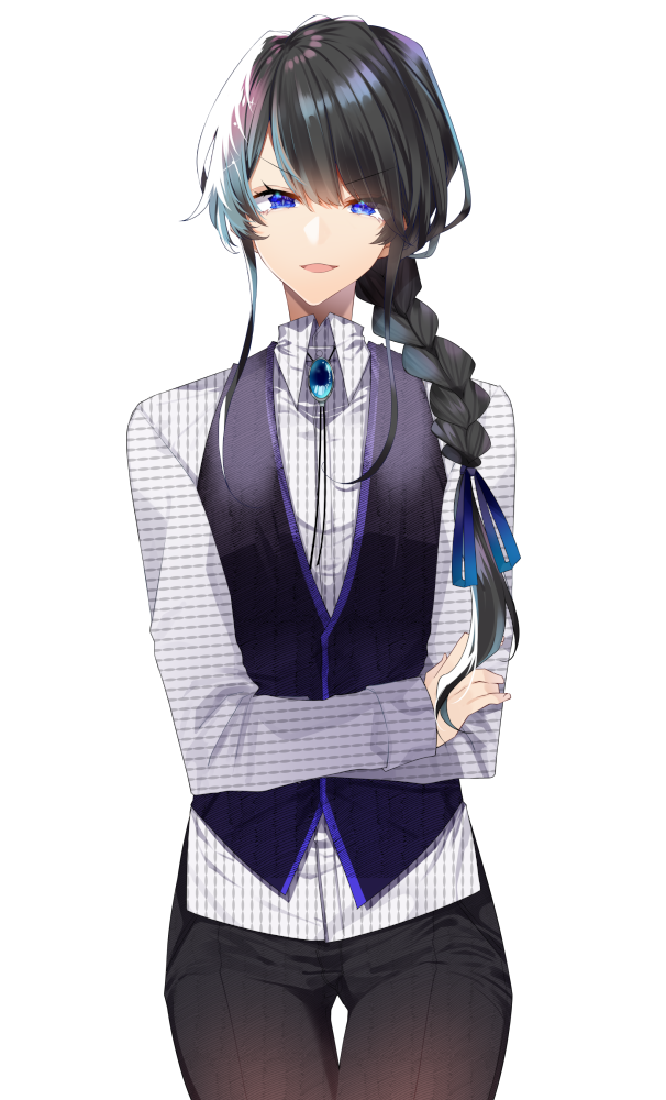 外見は中性的で整った容姿、長い黒髪と青い目が特徴的。