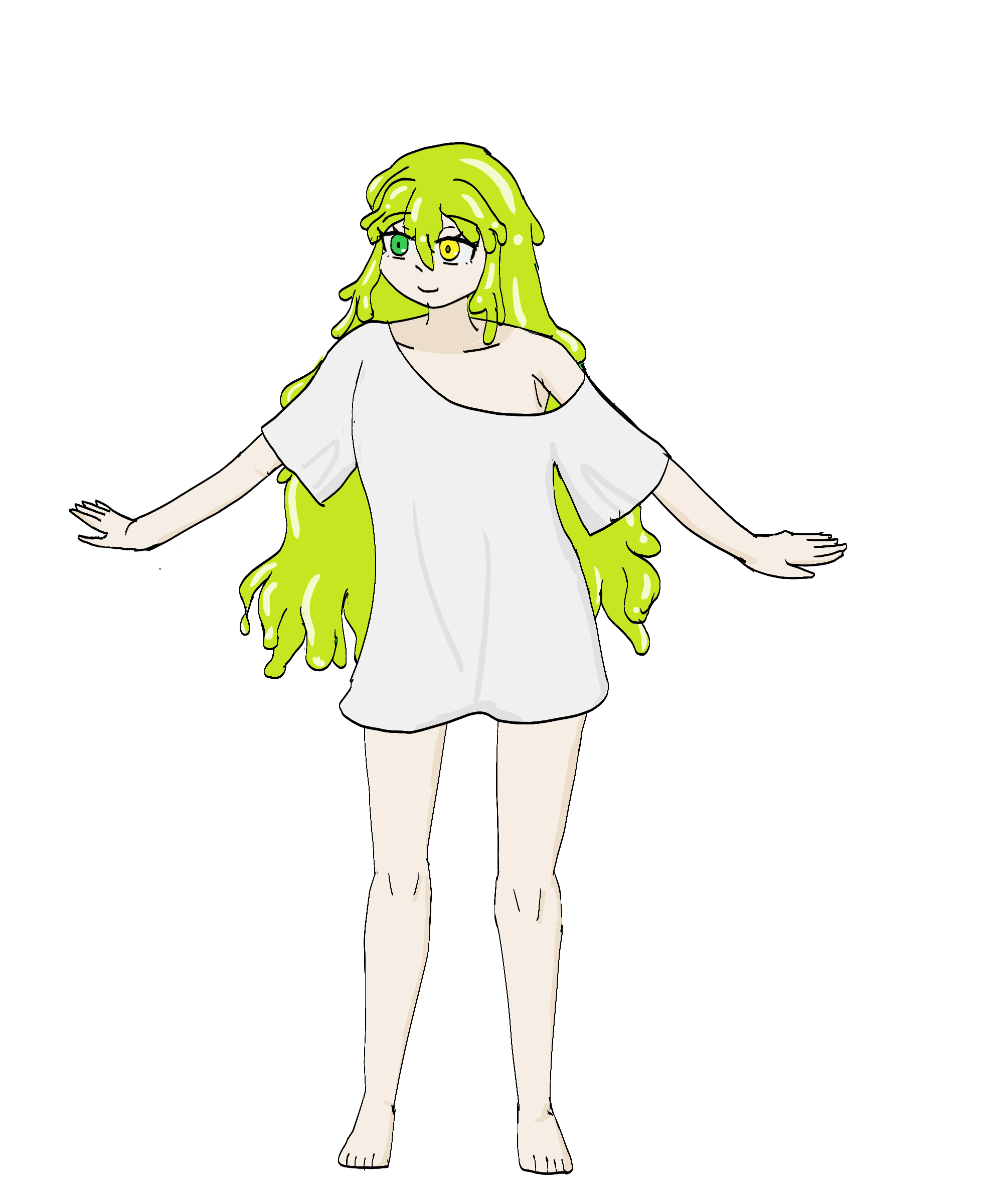 ちなみに完全体(人状態)になると、不完全体(人外状態)と違って極端に太く丸い体型にならず、ある程度圧縮した上で人間部分の外見を健康的〜グラマラスやマシュマロ体型と呼ばれる辺りのサイズに維持し、その他の圧縮しきれない分は異様に髪を長く伸ばしたり、人間に無い部位を生成してごまかしたりしている。