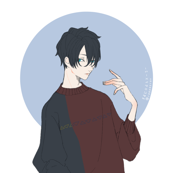容姿:黒髪で前髪が長い、冴えるような青い目が特徴。
