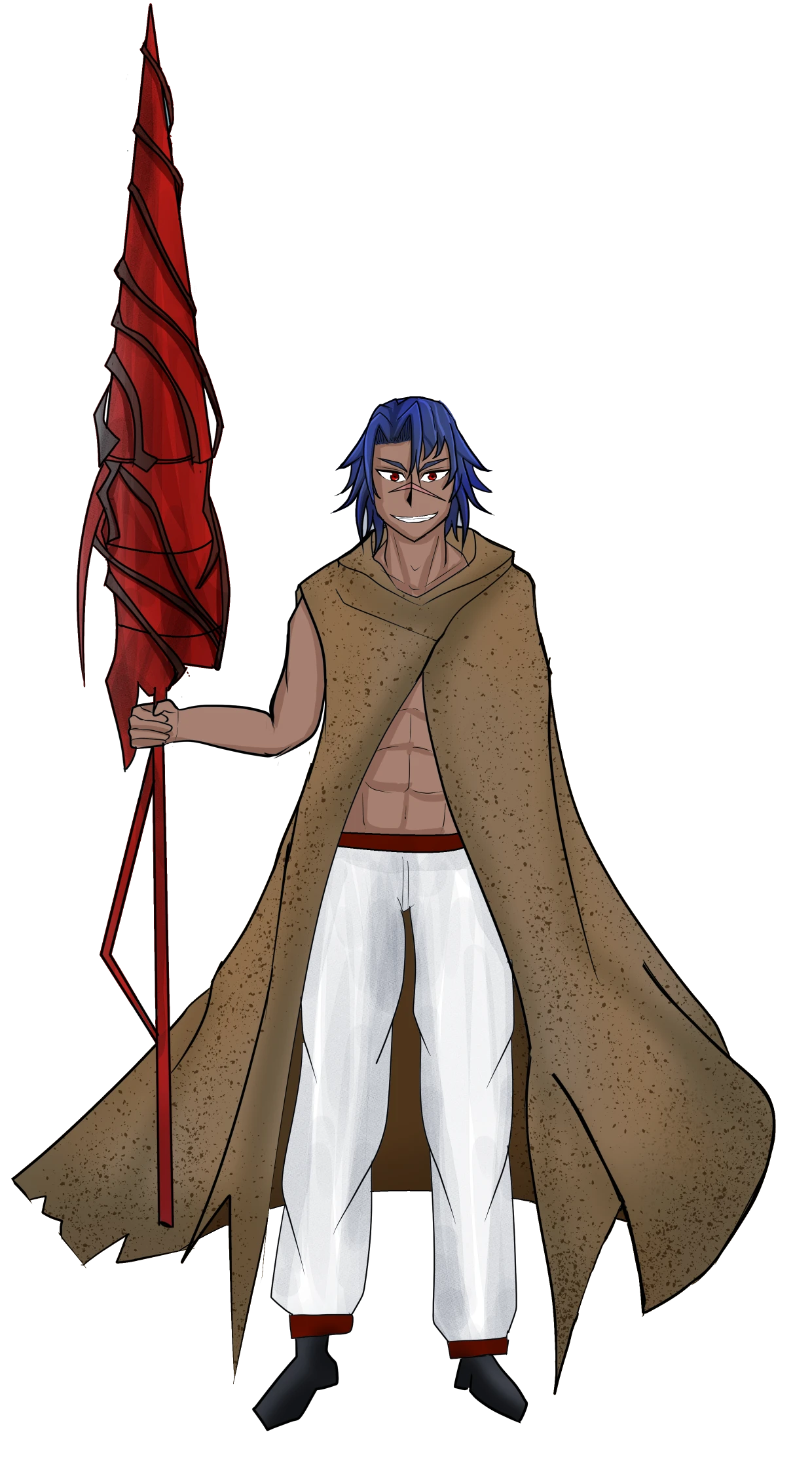 褐色吊り目の青い髪の青年。身体を鍛えていて引き締まっている。ボロボロの布(←かっこいいだろ!!)と胴着を合わせたコスチュームを好んでいる。身の丈以上の槍をぶんぶん振り回して攻撃する。だが、その真骨頂は改造した螺旋を描く構造にある。相手のガードごとえぐり貫く!!!