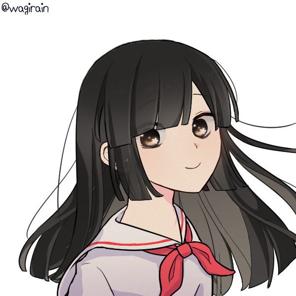黒髪で前髪ぱっつんのロングヘア。いわゆる姫カット的なもの。