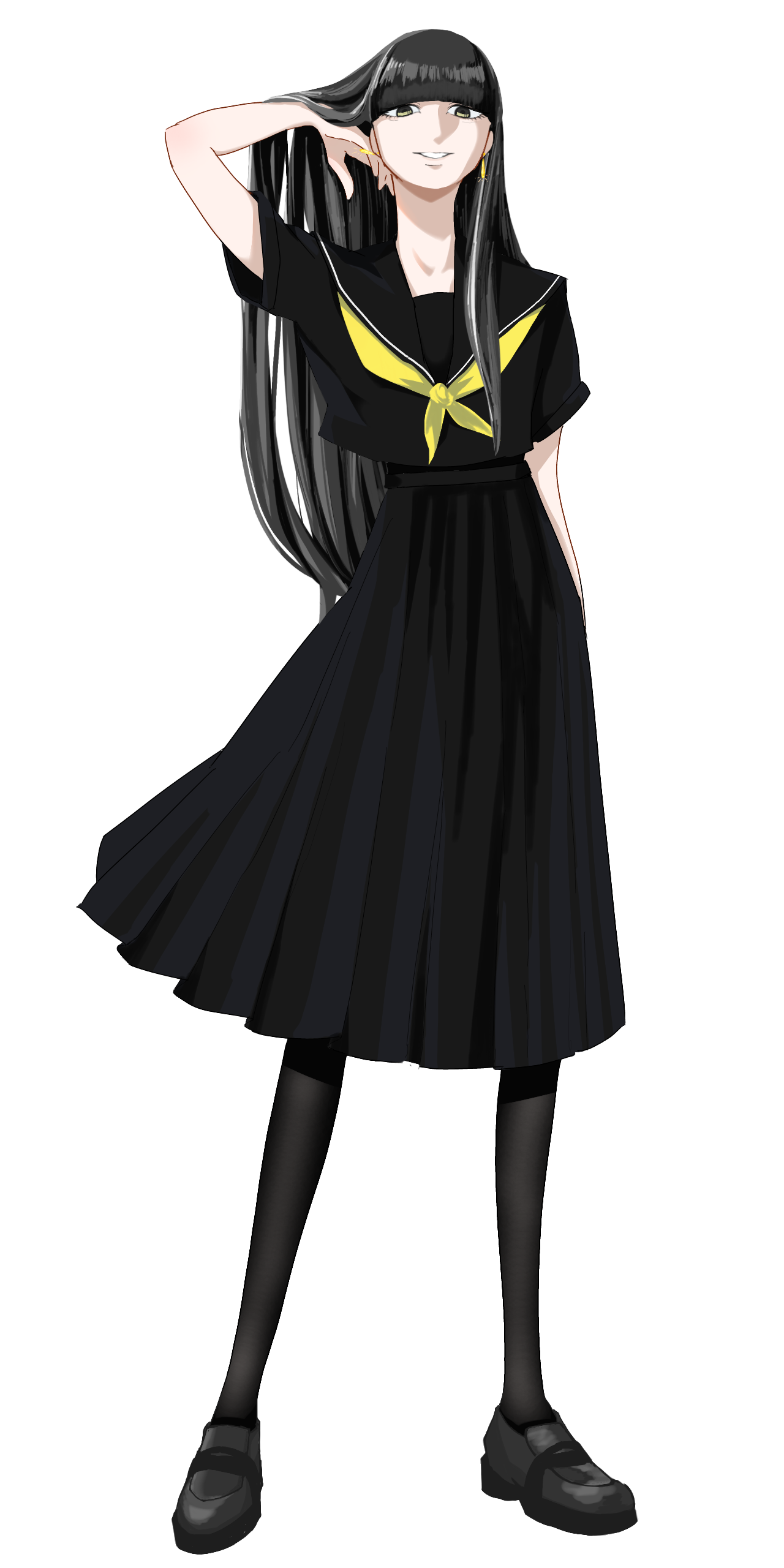 ぱっつん黒髪ロング。眉毛が隠れており表情が読めない。目が大きい。