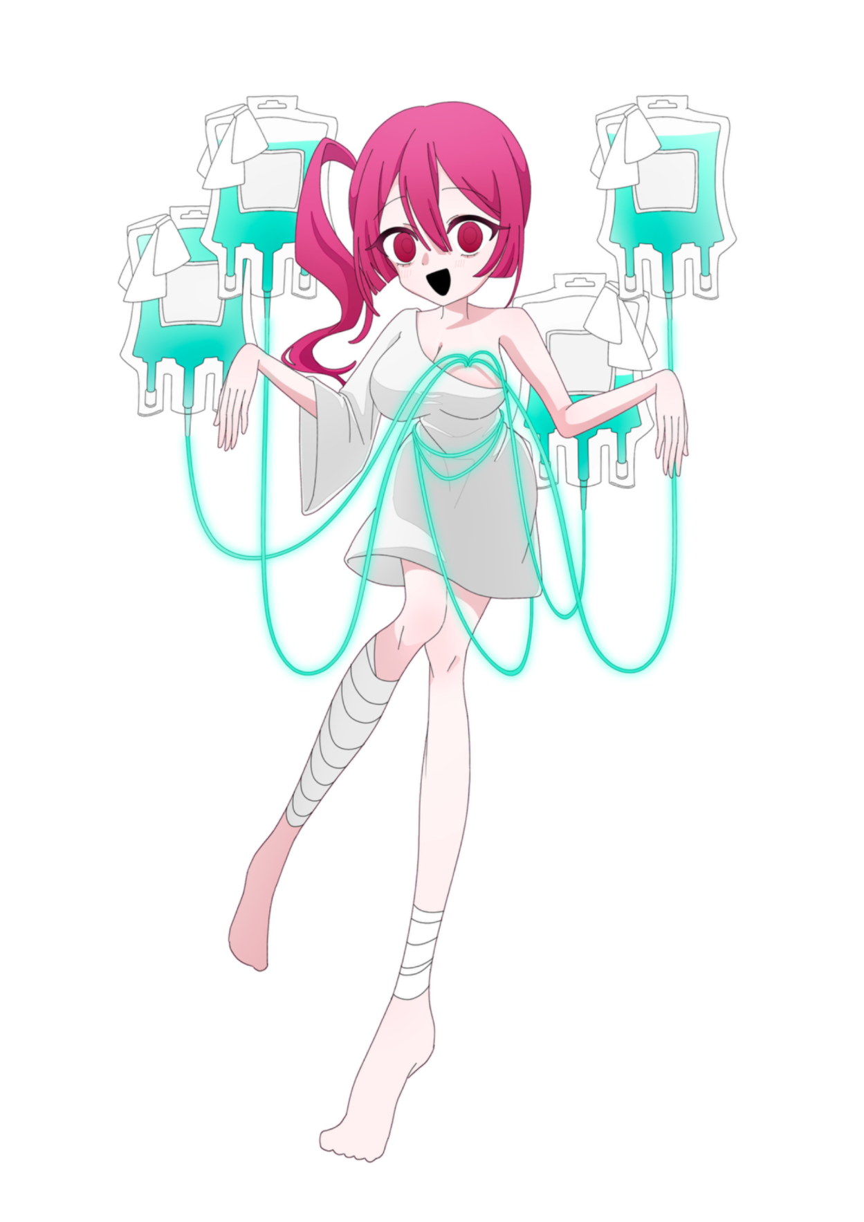 胴体左胸の辺りには動力部である体内のミュートスキューブと繋ぐように多数の点滴の管が通されており、その管を阻害しないようにゆるい衣服を着用している。