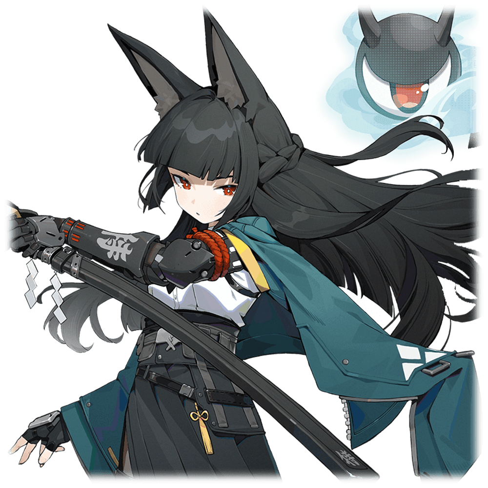 黒髪に大きな狐の耳が特徴的で、髪型は姫カットに編み込みハーフアップ。