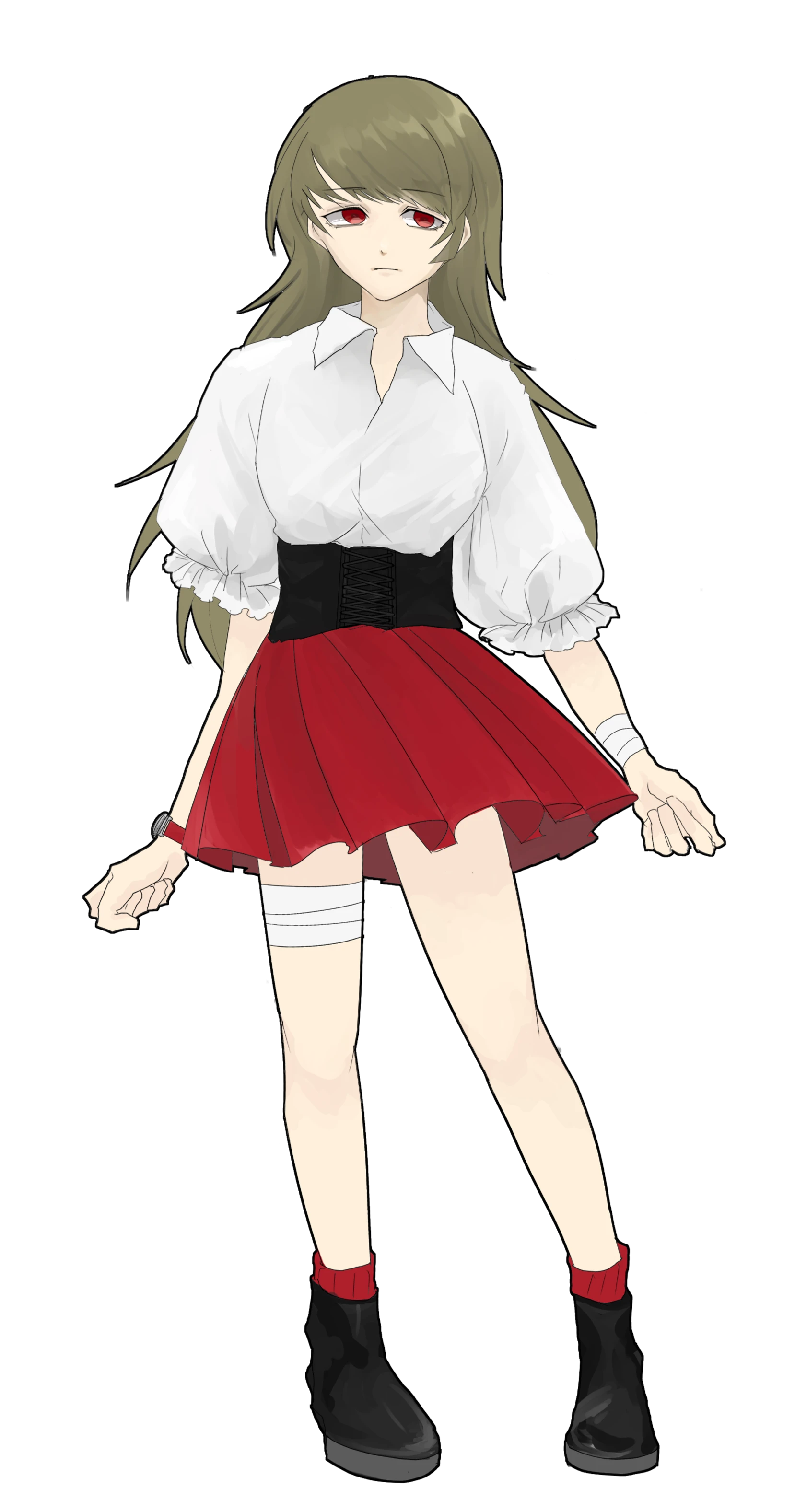 腕と太ももに巻いてある包帯は傷を隠すため兼、エフェクトを使いやすくするため。ここから流れる血液を操り従者を作成する。