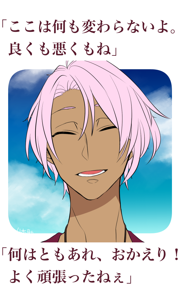 | 邂逅 | 「そんなある日、彼らが僕を見つけたんだ。それから、僕は彼らを手伝うようになって、今じゃこんなことになってるんだよ」 | |