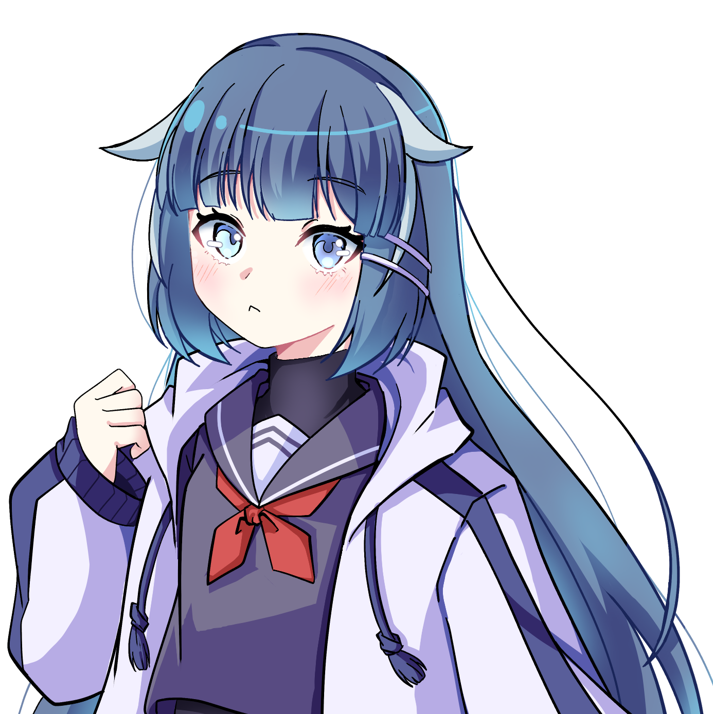 服装は制服にオーバーサイズのパーカーを着用し、サイバーなアクセサリーをいくつかつけている。常にメカ系の作品の武器と思しきキーホルダーをカバンに付けている。髪の毛はふわふわロングの藍色