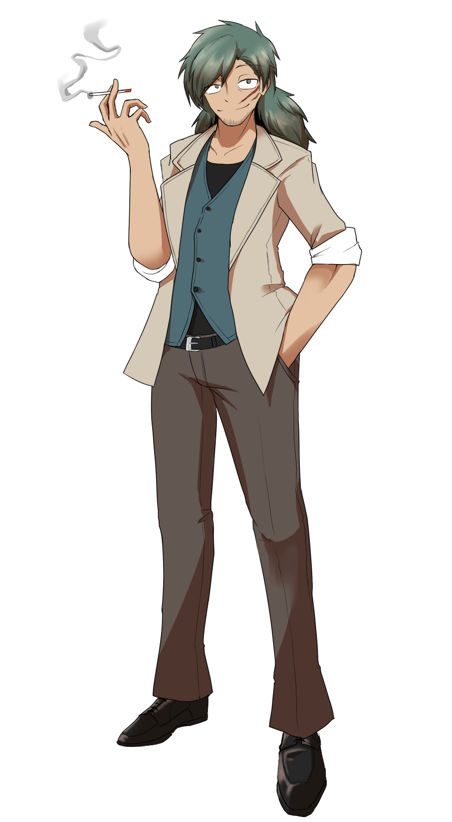 浅黒い肌と目元の傷跡、無精髭と乱雑な長髪が特徴。喫煙者。