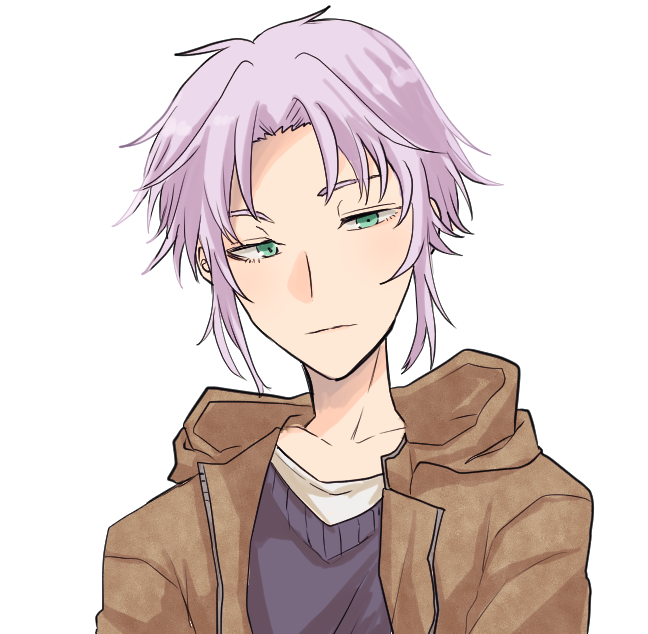 - 薄紫色の髪色で天パ、緑色の瞳