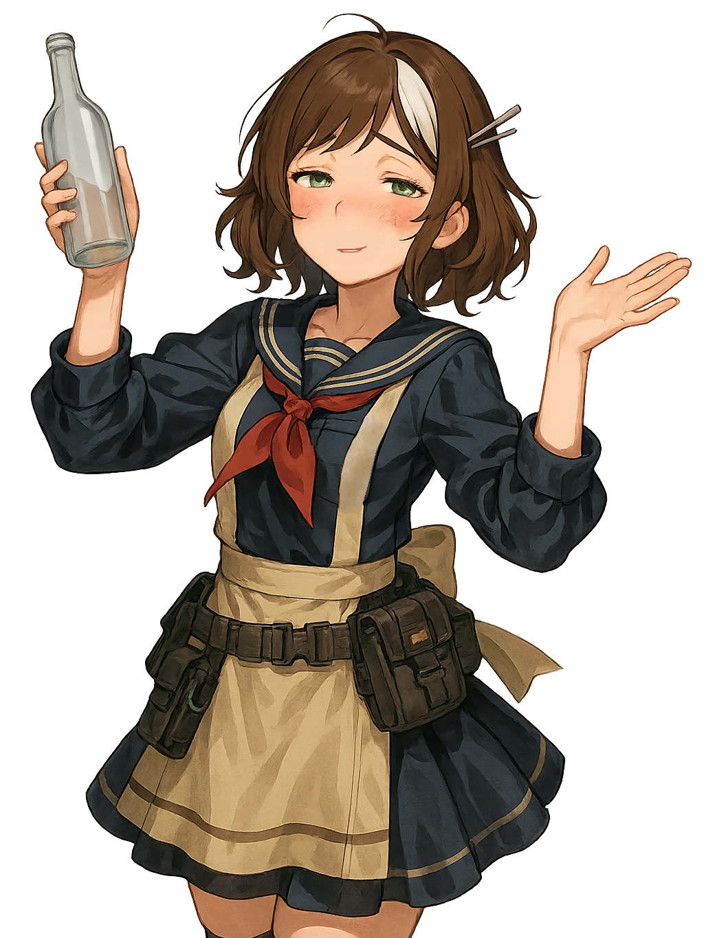 ・制服風の私服とエプロンスタイル。ポケットに小物を多数詰め込んでおり、雑多な物が覗いている