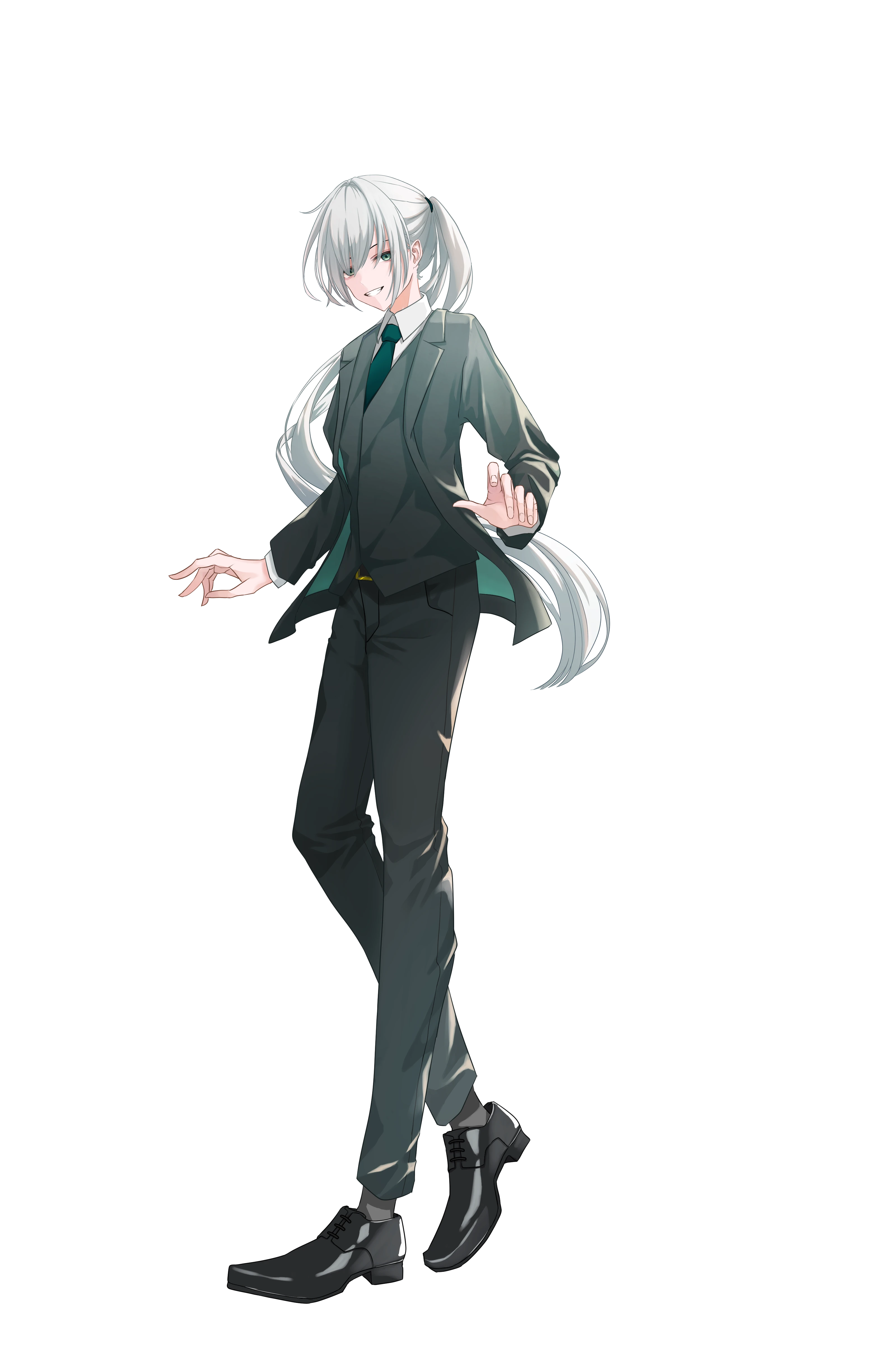 白髪ロングヘア。前髪結構長め。黒目が白く濁っている(白内障などで見られる症状と酷似)。仕事の時は大体黒スーツ。