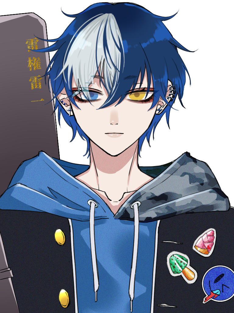 青みがかった髪に白のメッシュ。ブラックドッグに覚醒した瞬間、自分の雷に当たって脱色してしまった。何年たっても、何故か色素が抜けたままである。