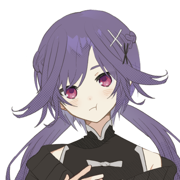 深いスリット入り漆黒チャイナドレスに肩出しカーディガン、黒のロングブーツ。薄紫の髪を後ろでぴょこっと二つに分けピンクのような瞳が特徴。