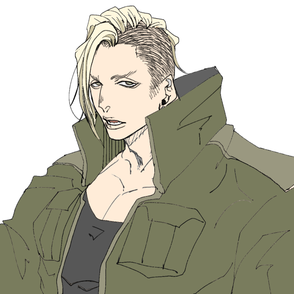 頭部の左側をざっくりと刈り上げて、右半分は少し長めの金髪を横に流している。垂れ目で灰色の瞳はやや眠たげに視線を寄こす。老け顔なので高校生に見られることはまず無い。背も高く体格も良い為、大人と然して変わらないもののまだまだ成長期の途中。手や足が大きい。服装はラフなものを好み、ピアスは最低限だがお洒落として楽しんでいる。偶に派手な柄シャツを着たい時もあり、しかし着てしまうとあまりにも目立つので最近では着用を控えている。