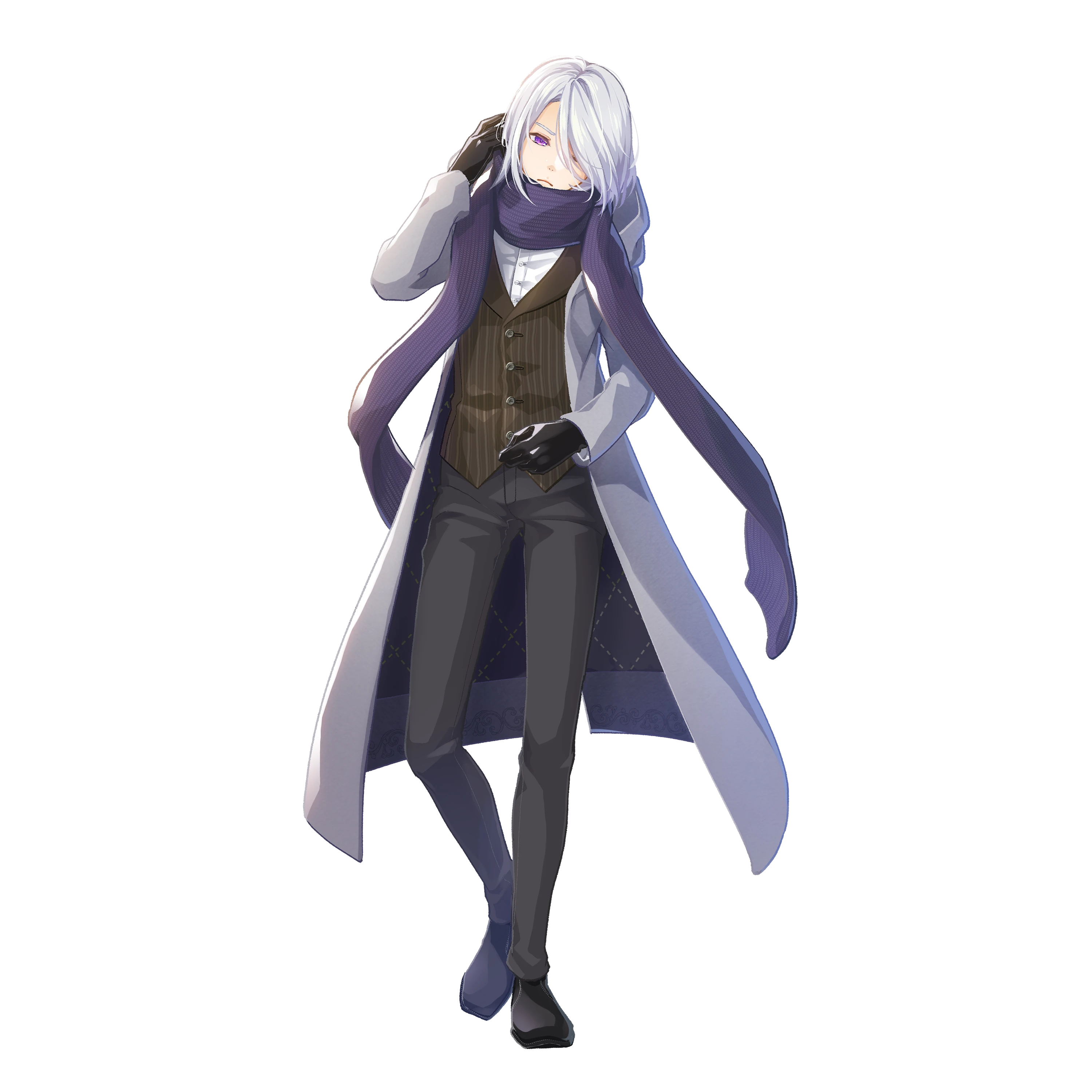 他の色の混ざらない白髪と、夜空のような紫の瞳の青年。例え周りが暑そうと、本人すら暑いと思いながらも袖が長い服装と黒手袋はデフォ装備だったりする。