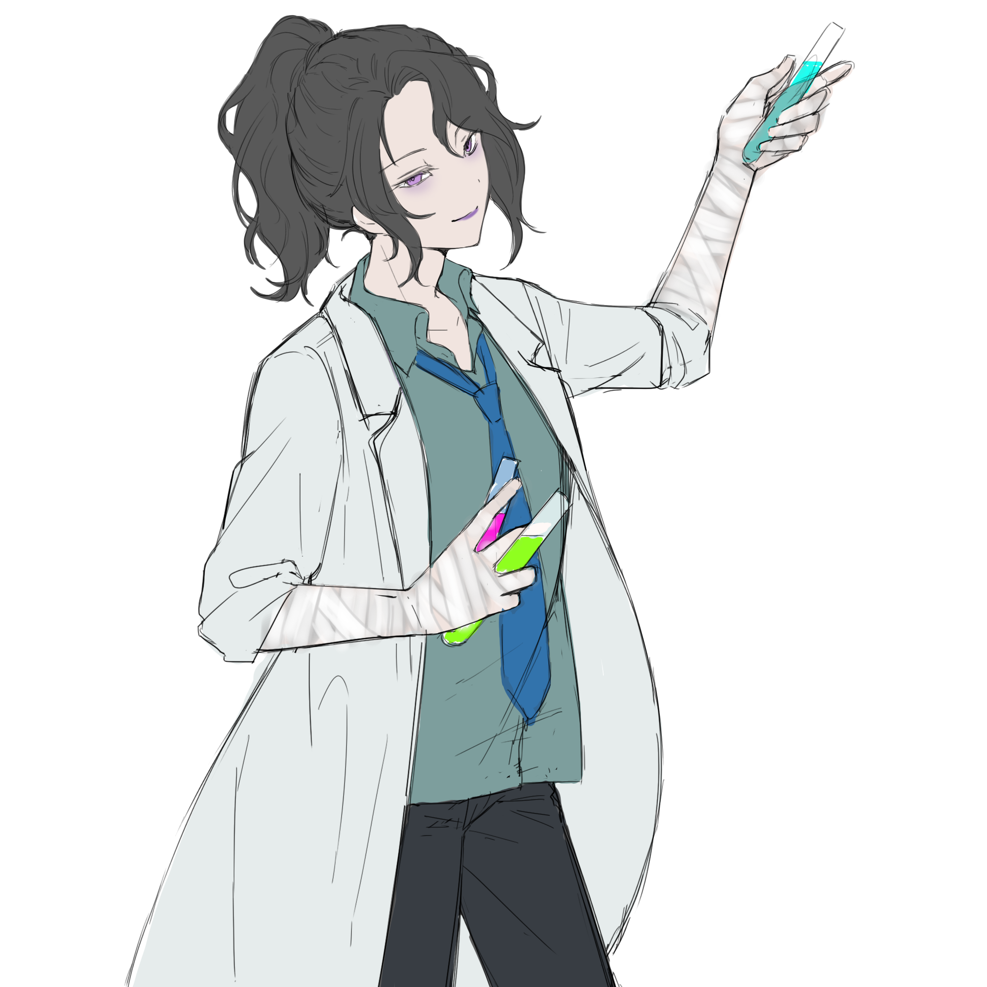 普段から白衣を身に纏い腕まくりをしており、腕には包帯が巻かれている。