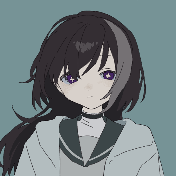 黒髪ミディアムヘア。前髪のポイントカラーで薄い灰色。