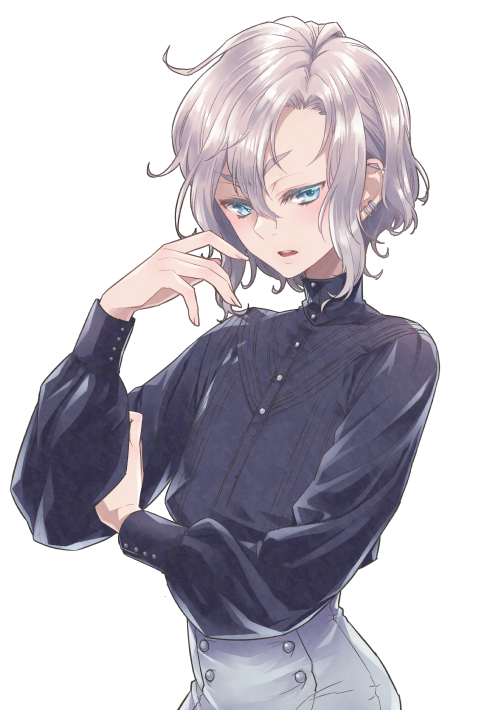 顔立ちはよく整っており、シルバーカラーの外ハネボブ。ターコイズブルーの瞳が映える陶器のような白い肌が特徴で、ハーフ特有の日本人離れした美形である。