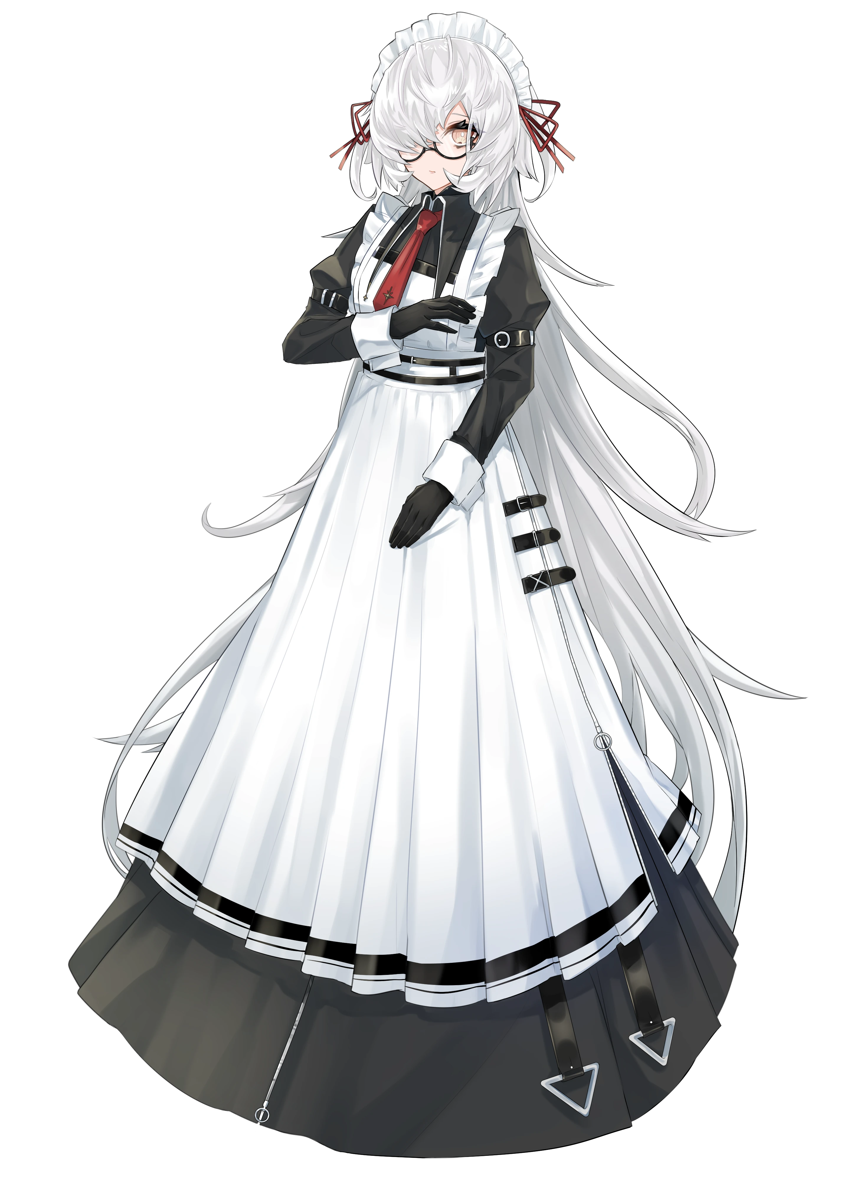 足元まで覆われたメイド服に身を包んでおり、顔以外の肌を一切露出していない。