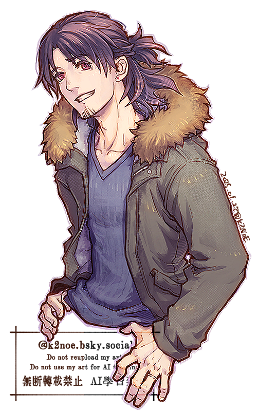 ツーブロックヘアーで癖の強い髪を後頭部で束ね(現在は髪を切りハーフアップ)、名前の由来でもある薊色の瞳を持つ青年。+ピアスに顎髭…と派手目な外見とフランクな口調のせいもあり、初対面の相手にはやや軽い印象を与えがち。『鍵いらずの歩み』を実行する度に全裸となってしまう為、任務時には自身の尊厳を護る為にモッズコートが手放せない。