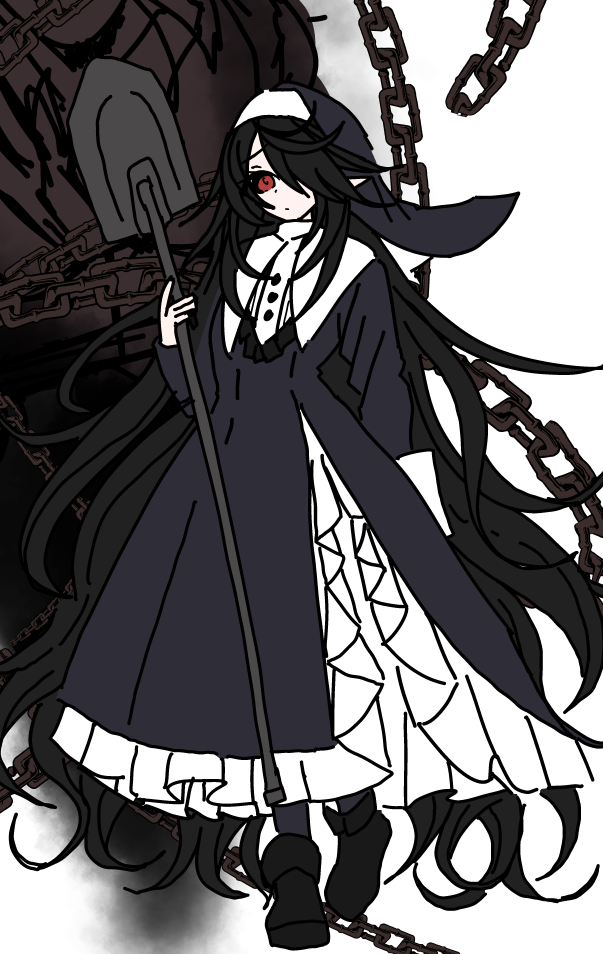 修道服を身にまとった前髪で隠れた片目の黒髪の長髪の少女。