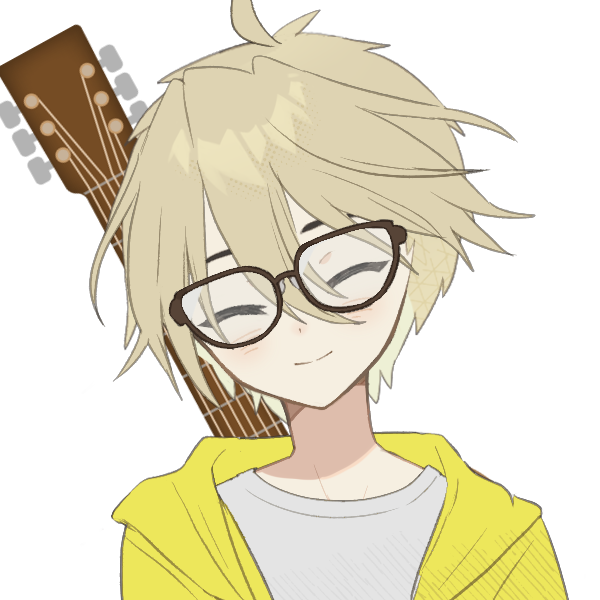 金髪、黄色のパーカー、背中にアコースティックギータ、黒縁のメガネ