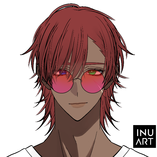赤髪に褐色の肌、緑と青のオッドアイ、顔に傷があり派手なサングラスをしている。