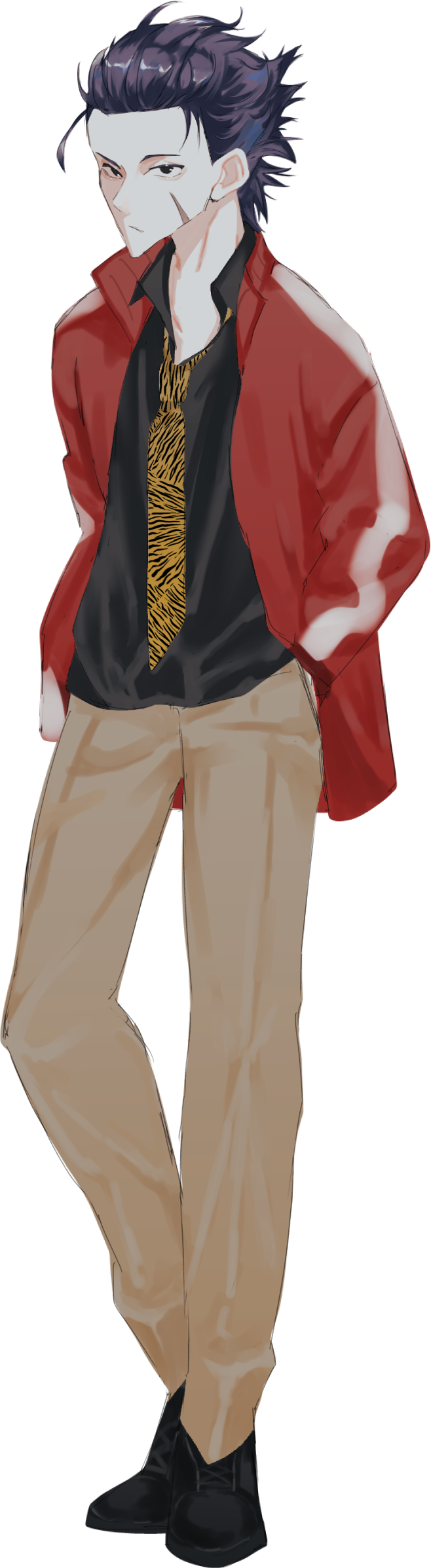 鋭い三白眼に荒っぽくオールバックにされた髪の、細身の男。凛々しい顔立ちだが、どこか濁ったような目と猫背気味な姿勢、そして顔にある傷のせいで、あまり女性受けはしない。体力はあまりなく、運動も好きでは無いようだが、なぜか赤いジャージをシャツの上から身に付けている事が多い。