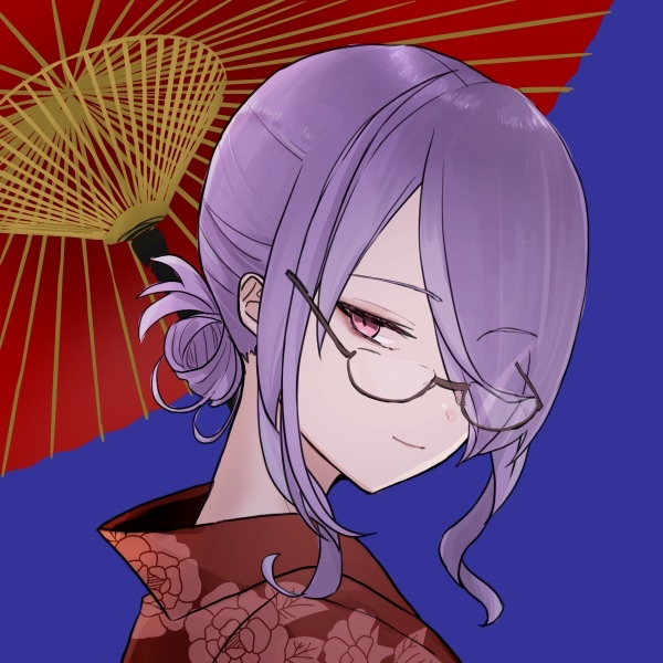 薄紫のシニヨン。メガネ、切れ長の隠れ片目。着物を着た年若い女性。