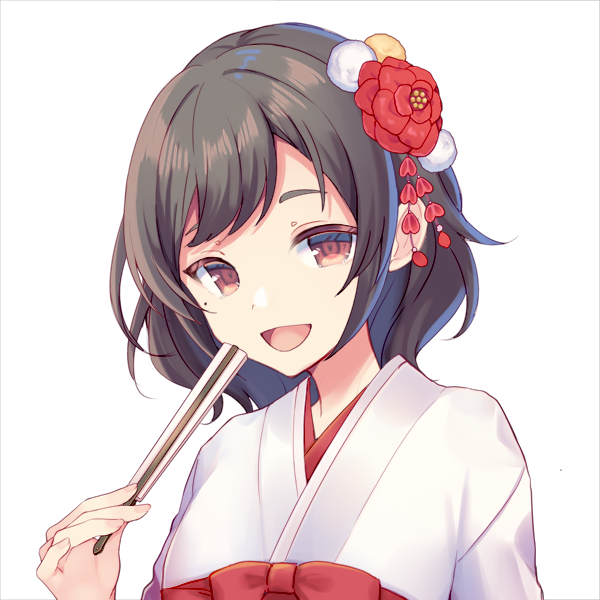 花の髪飾りを付けている。