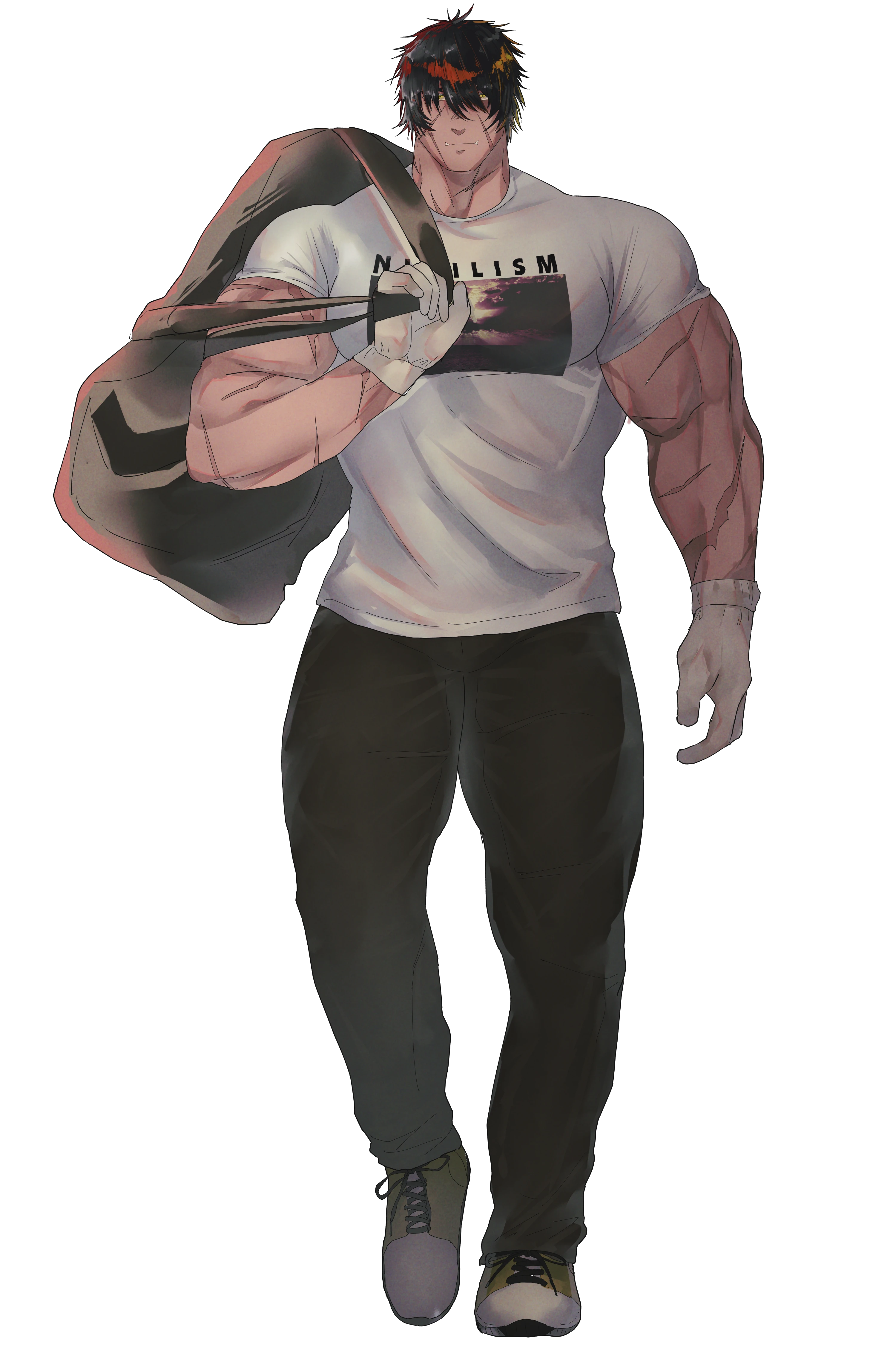 黒髪金髪。筋肉質で長身。全身に傷跡があり、かなりいかつい印象を与えがち。