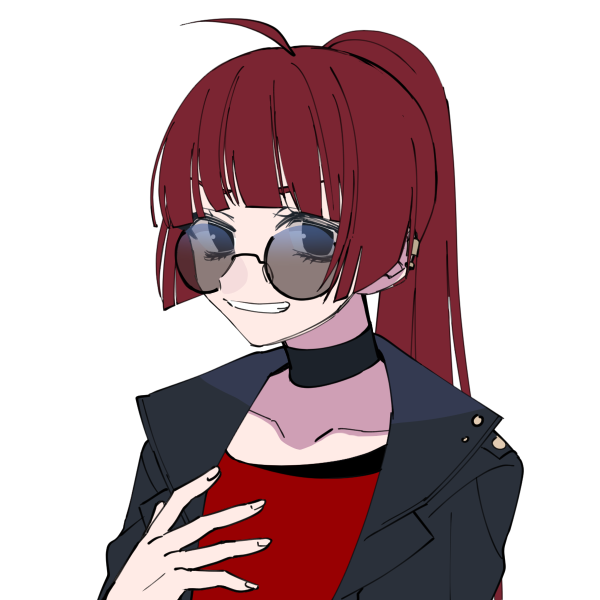 真っ赤なロングヘアーを一本に結えたヘアスタイル。黒のレザージャケットを羽織り丸レンズのサングラスを着用したカジュアルコーデが特徴。