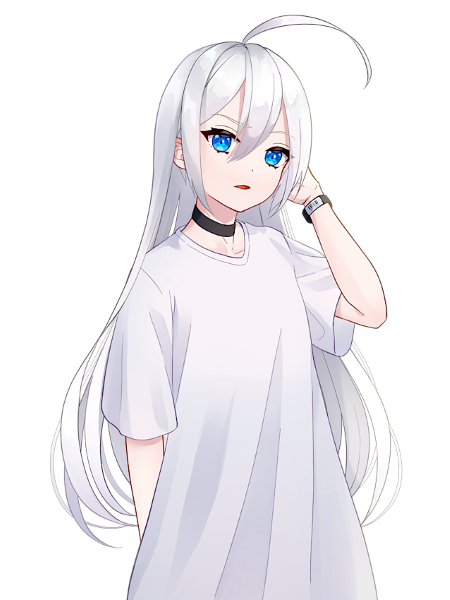 髪 サラサラとした白髪をロングヘアにして腰程まで伸ばしている。また、一本のくせ毛が感情に反応してピコピコ動く。