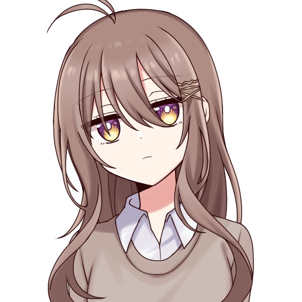 長くサラサラした茶色のロングヘアと二つ分かれのアホ毛が特徴。瞳の色は砂色、瞳の中央が小さい白い丸がある少し変わったもの。