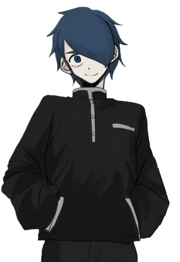 青髪で前髪が片方の目を隠している。