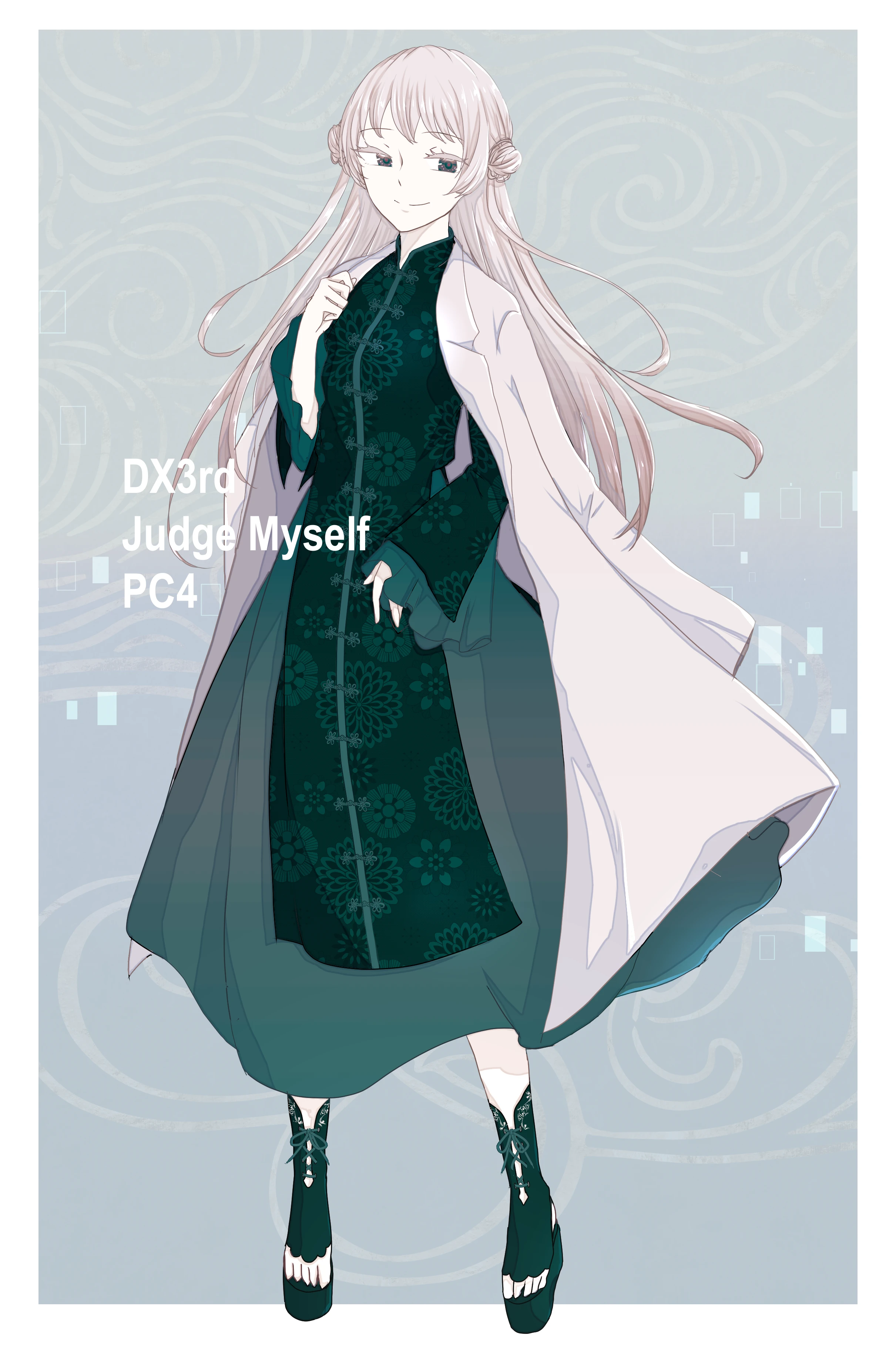中華風のワンピースに白衣を羽織っている