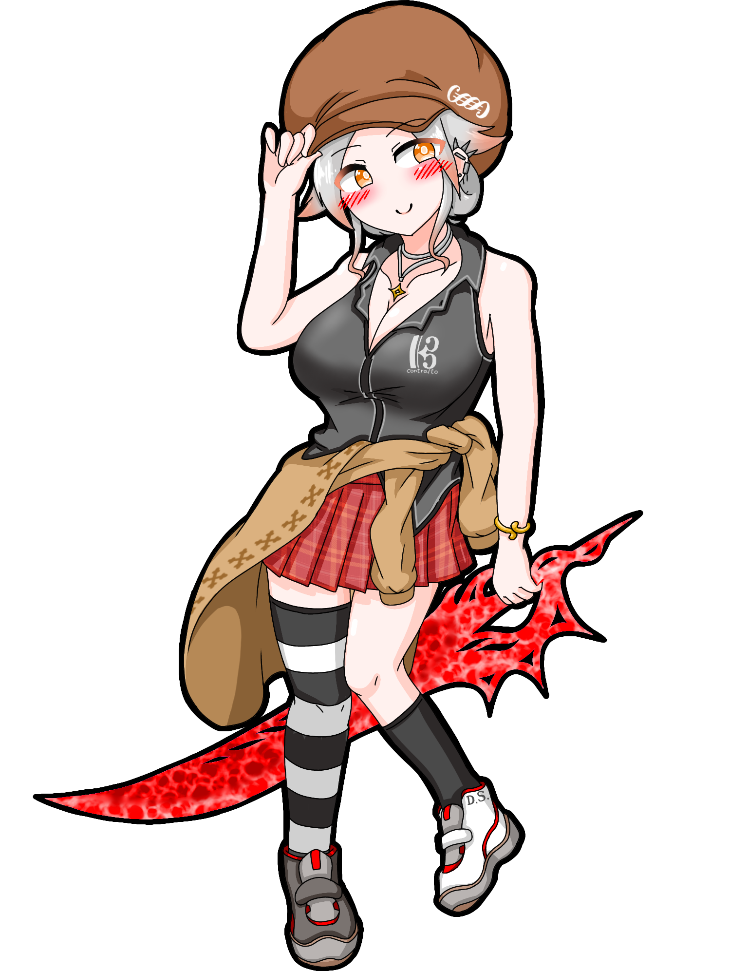 キャスケット帽に銀の髪を纏めている。本来の髪の長さはロング(胸くらいまで)。