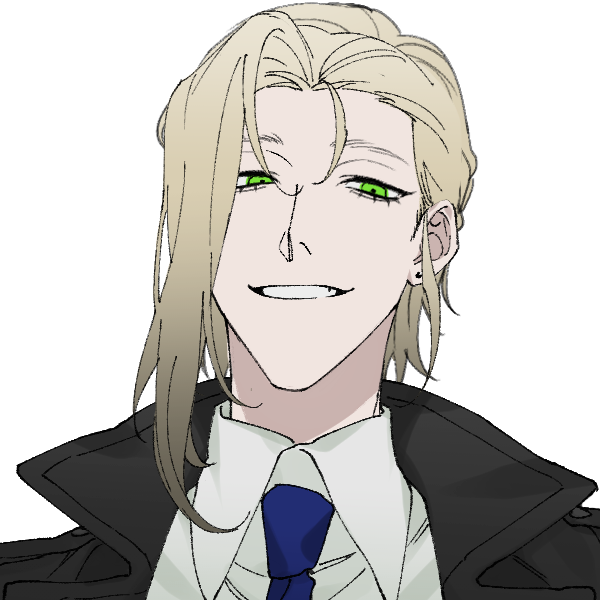 ニヤケ面。金髪と緑色の目。