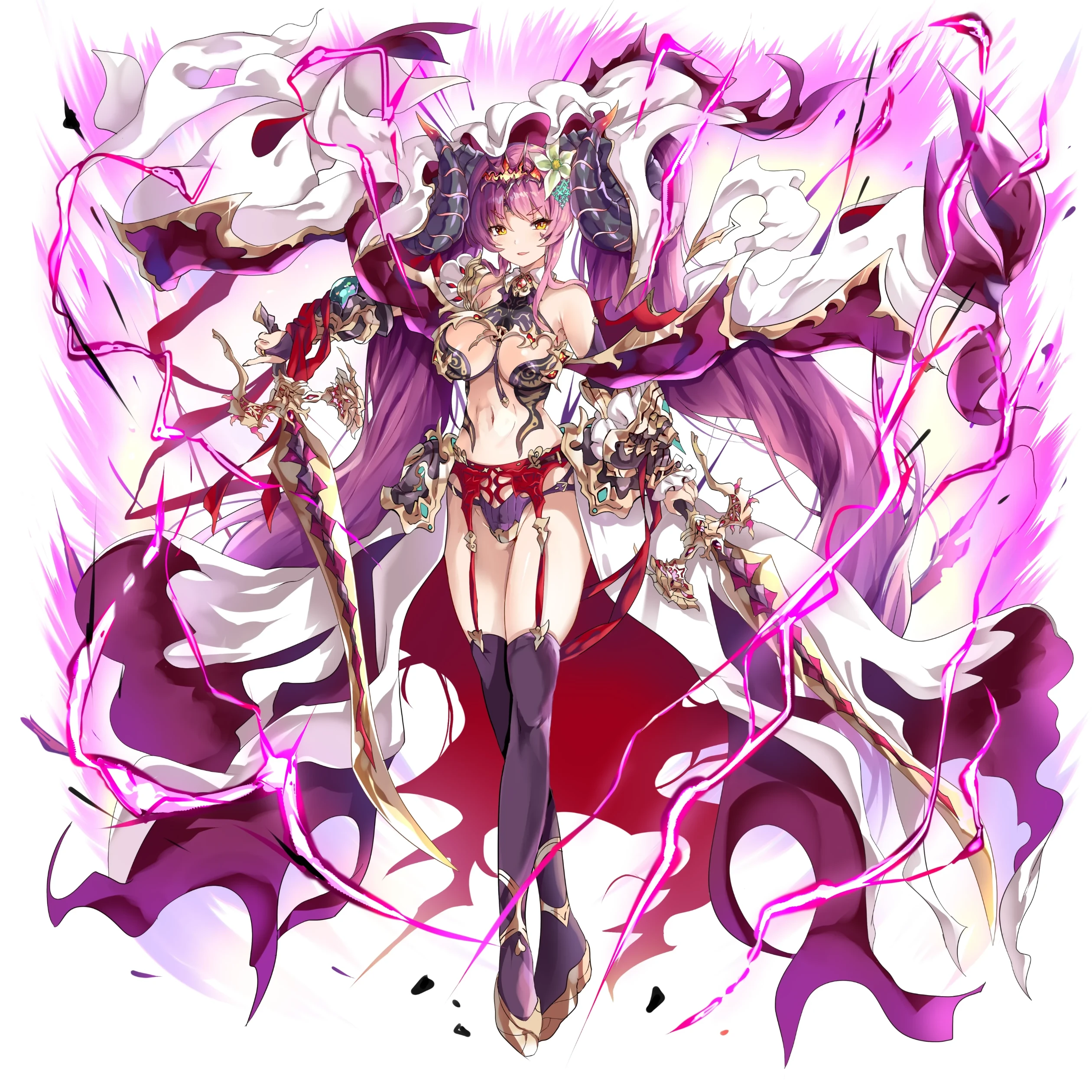 その権能は色に対応した身体強化の加護のあるオーラを自在に纏い、状況に応じた強化を変えていくもの(その為かシンドロームとしてはウロボロスに該当している)。加えて魔王の所有していた双剣型の神剣"絢爛冥刃アトラ・ク・ナクア"の複製品を顕現させる事が可能であり、これらの得物による白兵戦が彼女の戦法となる。