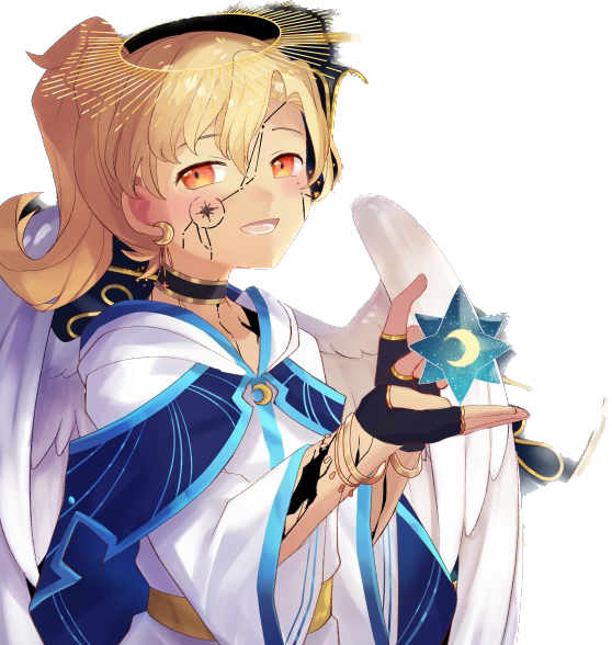 見るものを魅了するような中性的な顔、ブロンドのポニーテールに青と金で縁取られたローブ、何より背中に生える純白の翼と頭上に浮く光輪、肉体に走る星座線のタトゥーと、ヒビ割れのような紋様があまりにも特徴的すぎる外見。天使としての秀麗さをベースに、悪魔としての醜さがヒビとして浮き出ているような。ヒビは実際に割れており、中は吸い込まれるような虚空になっている。