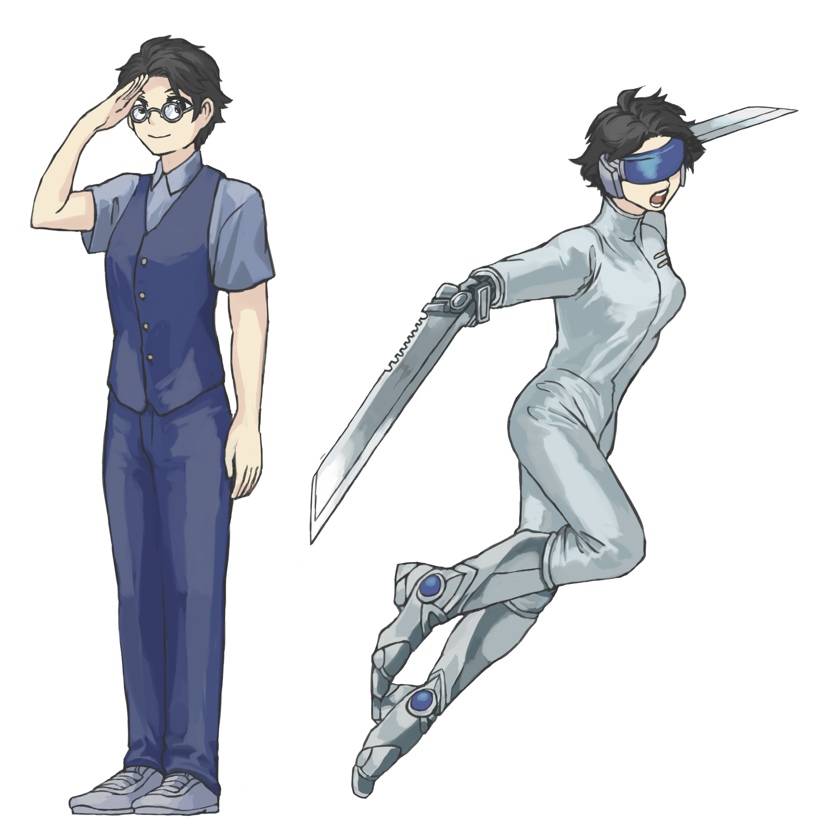 戦闘時には白いラバースーツと青いバイザーを纏った姿になる。