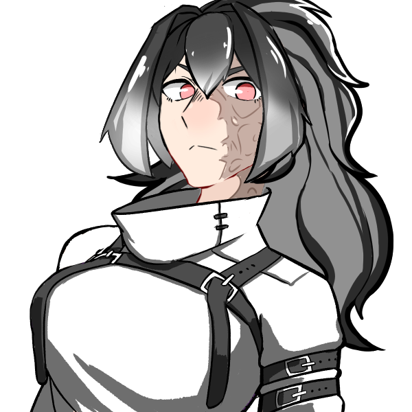 銀色がかった黒髪。毛量が非常に多く、ぼさぼさした髪を強引に結んでいる。目は桃色。
