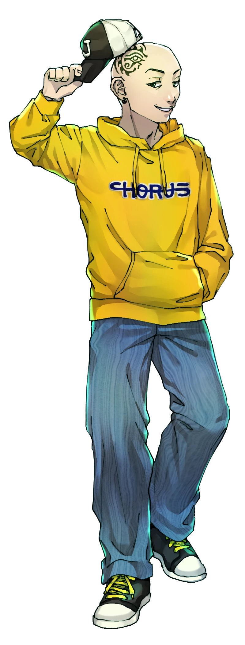 スキンヘッドに目をモチーフにしたタトゥーが彫られたまあまあイカチぃ見た目。